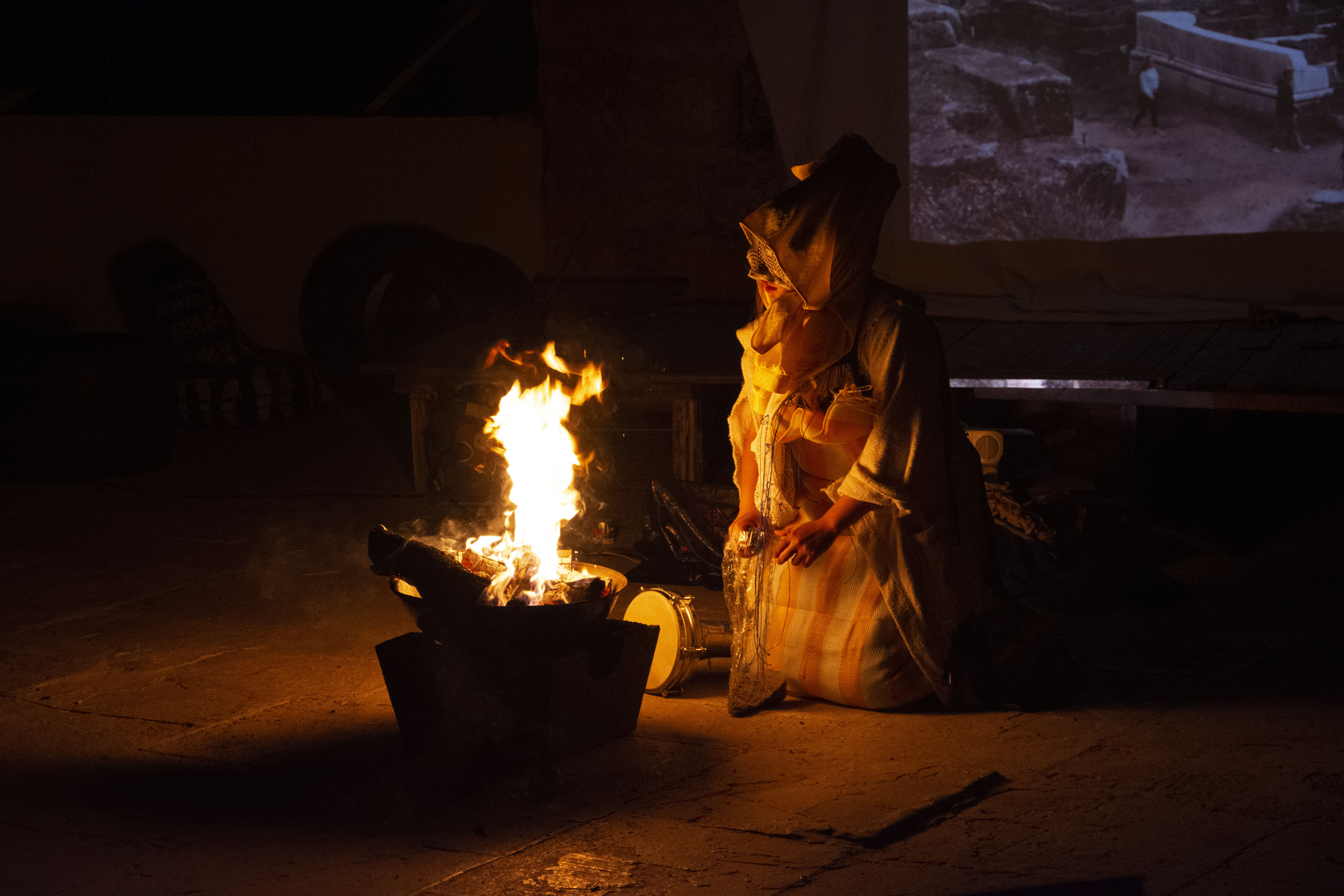 Amygdalium Impressioning is an experimental project in collaboration with artist Markella Ksilogiannopoulou and theatre director Shimin Ji, realised during our residencies in Athens. The installation included a video projected on the wall, a fire pit burning lavender, a diagram drawn on the ground, with candles and objects lying around, and a live performance.